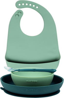 Nattou Set jídelní silikonový s bryndáčkem bez BPA, Zelený 4 ksVše o produktuDoplňující informaceHodnocení produktuZaoblené vnitřní hrany misky a talířku usnadňují nabírání jídla dětem i jejich rodičům. Lžička je dokonale přizpůsobena malým rukám a ústům kojenců a batolat, takže je ideálním společníkem při krmení a učení se samostatnosti. Spolu se silikonovým bryndáčkem mohou rodiče a děti jíst bez obav a užívat si vzájemné společnosti.