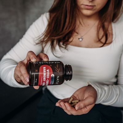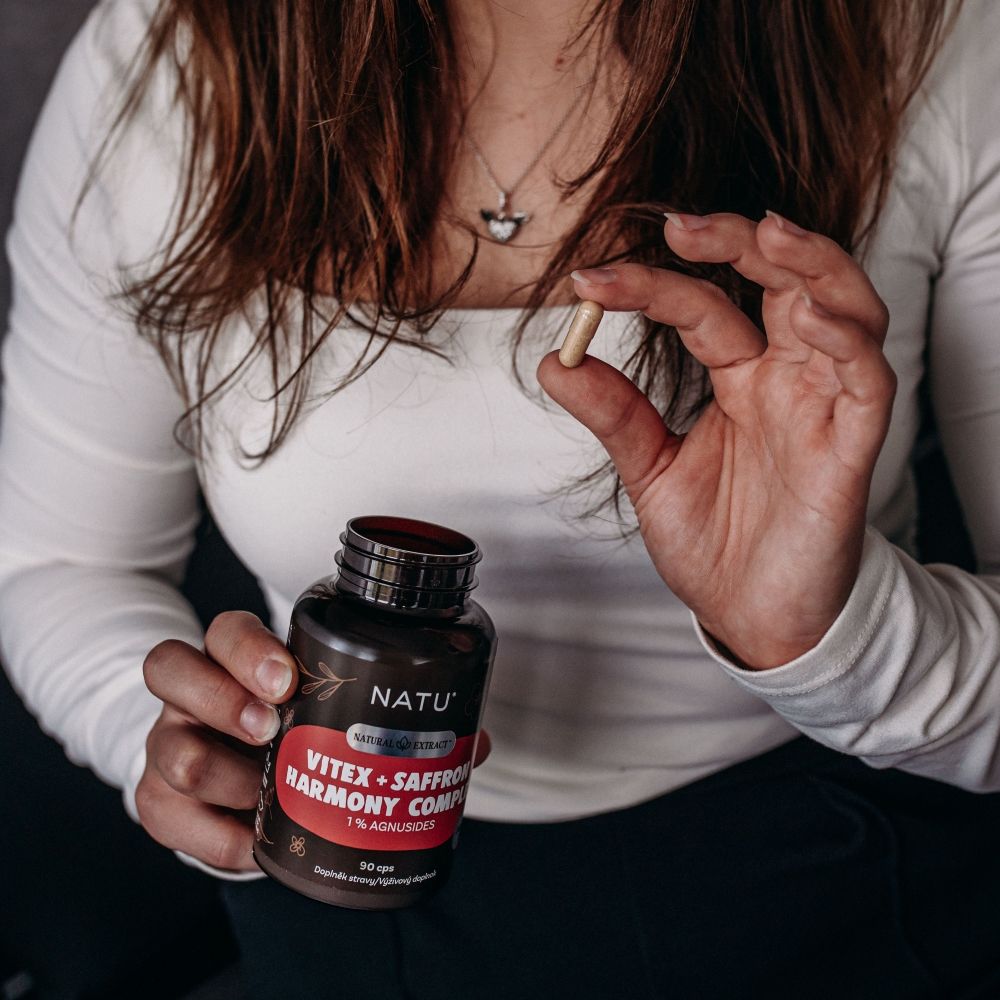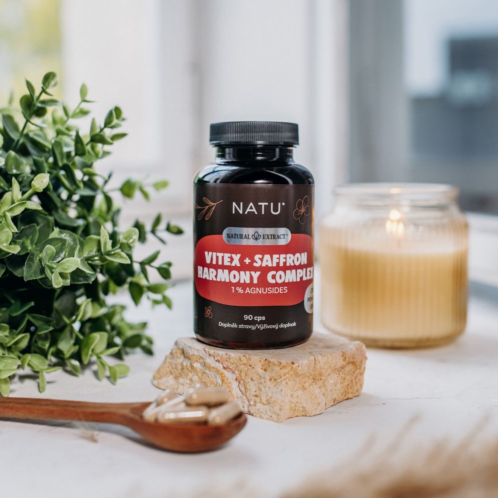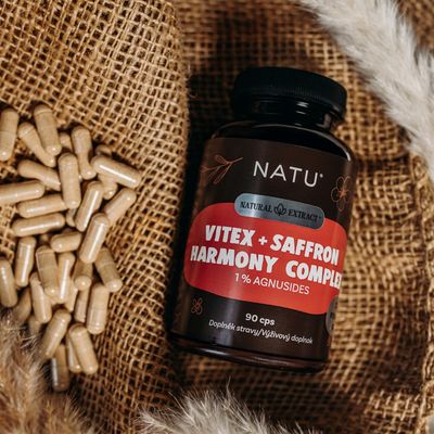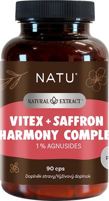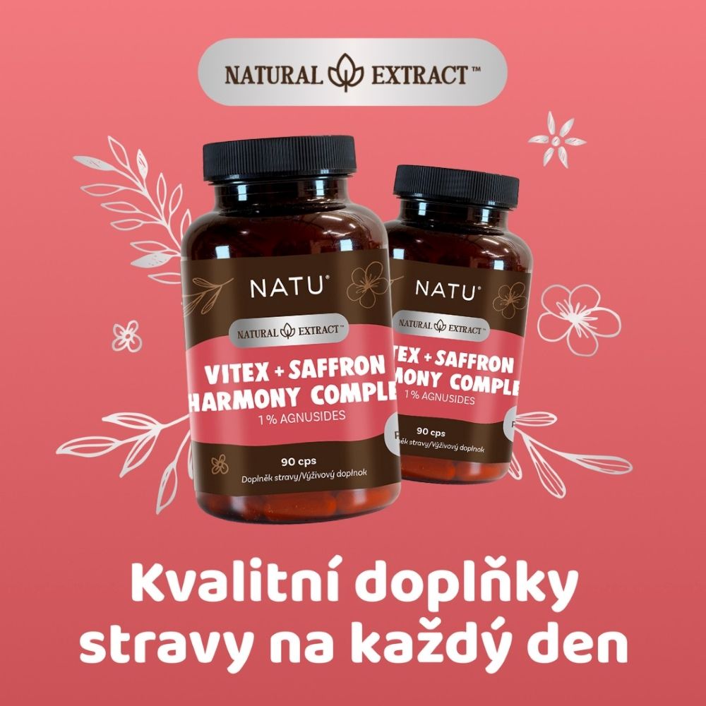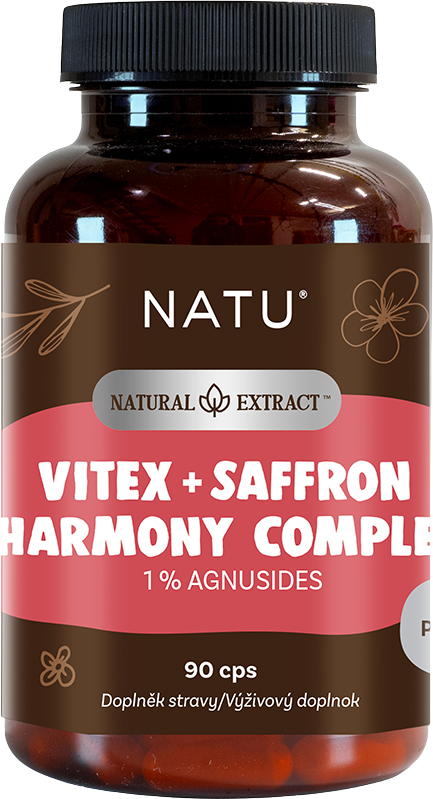 Natu Natural Extract, Drmek extrakt (1% agnusidů) se šafránem 90 kapslíVše o produktuDoplňující informaceHodnocení produktuVitex & Saffron Harmony Complex je prémiový doplněk stravy pro přirozenou hormonální rovnováhu a duševní pohodu ženy. Obsahuje standardizovaný extrakt z drmku obecného (Vitex agnus-castus) s mimořádně vysokým obsahem 1 % agnusidů – aktivních látek. Kombinace s extraktem ze šafránu působí synergicky na emocionální stabilitu.Tento prémiový doplněk stravy byl vytvořen pro ženy, které chtějí podpořit své tělo přirozenou cestou – v souladu s biorytmy organismu, bez hormonů.