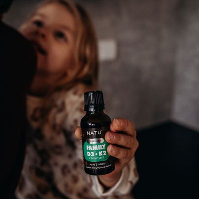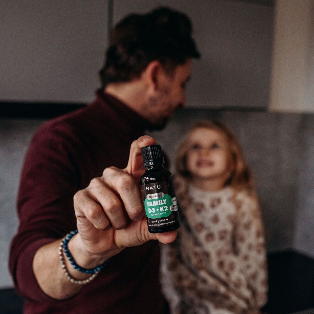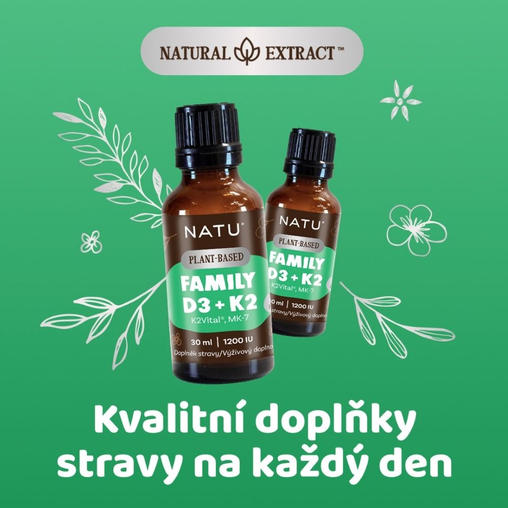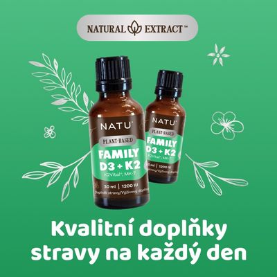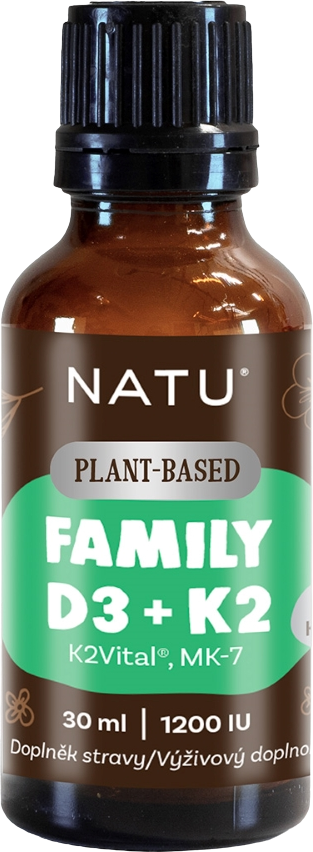 Natu Plant-Based, Family Vitamin D3+K2 (MK-7) vegan 30 mlVše o produktuDoplňující informaceHodnocení produktuFamily Vitamin D3+K2 přináší unikátní spojení dvou patentovaných forem vitaminů – rostlinného vitaminu D3 - PineD3™ z borovice, a špičkového vitaminu K2VITAL® DELTA MK-7 z Norska. Díky tomu se jedná o produkt s vysokou účinností, stabilitou a čistotou, který je vhodný pro celou rodinu – od dětí od 1 roku až po seniory. Doplněné o nosič v podobě bio MCT oleje z kokosu pro správné vstřebávání a snadné dávkování.