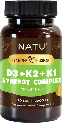 Natu Garden Fusion, Vitamin D3+K2+K1 Synergy Complex 2000 IU, 90 kapslíVše o produktuDoplňující informaceHodnocení produktuVeganský doplněk stravy s patentovanými formami vitamínů D3 (PineD3™ z borovice) a K2 (K2VITAL® DELTA MK-7 z Norska) doplněný o vitamin K1. Pro podporu imunity, zdravé kosti a zuby. Obohacený o funkční směs Garden-Fusion Nutrient Matrix™ – 18 bio rostlinných extraktů, probiotik a enzymů pro synergický účinek a lepší vstřebatelnost. Komplexní řešení v jedné kapsli.
