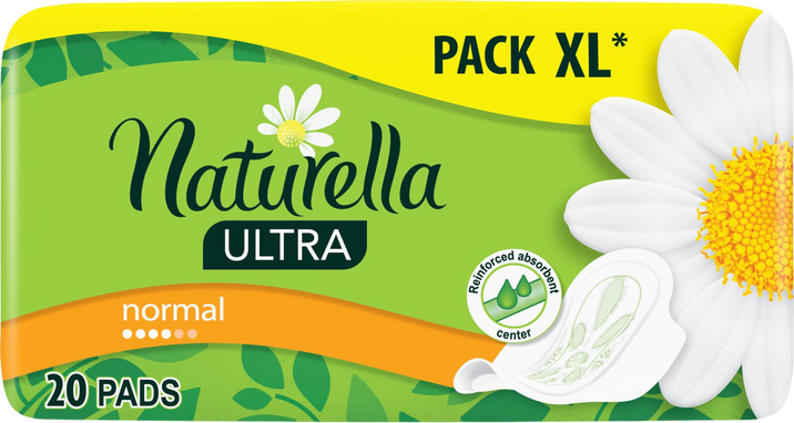 Dámské hygienické vložky Ultra Normal Camomile s křidélky, která pomáhají držet vložku bezpečně na místě. Více informací