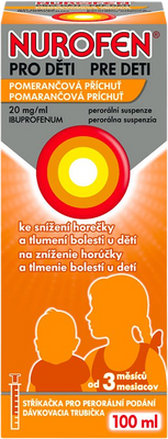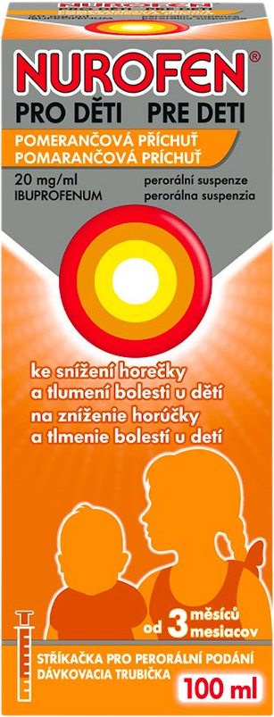 Nurofen pro děti s účinnou látku 20mg/ml určený pro děti od 3 měsíců. Dávkování podle váhy dítěte. Pomáhá snižovat horečku a tlumí bolest zubů, uší, hlavy, v krku a bolesti spojené s pohmožděním. Odstup mezi dávkami je 6-8 hodin.