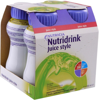 Nutridrink Juice Style s jablečnou příchutí je vysokoenergetická tekutá výživa. pro řízenou dietní výživu při podvýživě související s nemocí. Bez lepku. Baleno v ochranné atmosféře. Ošetřeno UHT. Pouze pro enterální použití. Pouze pro použití pod lékařským dohledem. Nevhodné jako jediný zdroj výživy. Více informací