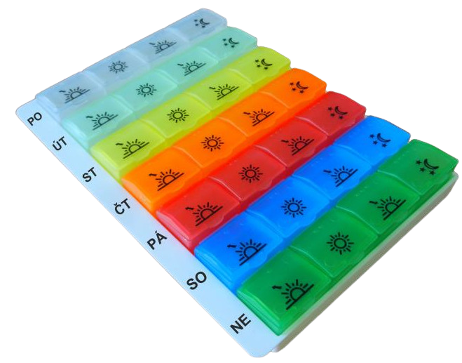 Kvalitné spracovanie odolný plast rozlíšený farebne pre jednotlivé dni. Vyrobené v ČR. 4 kolónky vhodné pre pacientov ktorý užívajú viacero liekov počas dna. Každý deň sa dá samostatne vybrať a zobrať so sebou.