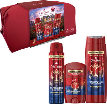 Old Spice Tomorrowland, Dárková sada - Tuhý deodorant, deodorant ve spreji, sprchový gelVše o produktuDoplňující informaceHodnocení produktuOld Spice Tomorrowland Xmas dárková sada je navržená pro muže, kteří chtějí spojit moderní styl, každodenní péči a výraznou vůni s charakterem. Limitovaná edice inspirovaná atmosférou festivalu Tomorrowland přináší jedinečnou kombinaci bergamotu, šťavnatého jablka a dřevitých akordů, která okamžitě zaujme a dodá sebevědomí. Sprchový gel osvěží celé tělo, deodorant ve spreji dodá okamžitou svěžest a tuhý deodorant zajistí spolehlivou ochranu proti zápachu po celý den. Produkty jsou uloženy v praktické kosmetické taštičce, kterou lze pohodlně využít na cestách nebo doma jako organizér. Limitovaná edice potěší stylovým zpracováním a vůní, která zůstává v paměti.