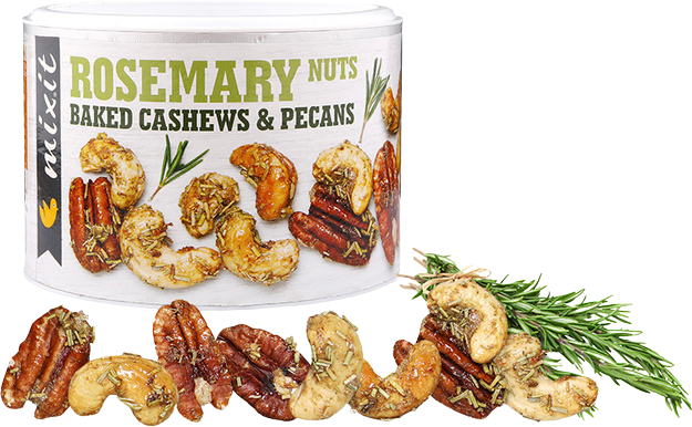 Pochutnejte si na křehkosti pekanových ořechů a kešu, které jsme zapekli s růžovou hrubozrnnou solí, rozmarýnem a citronovou trávou.