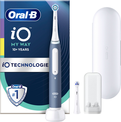Oral-B iO My Way elektrický zubní kartáček, 1 modrá rukojeť, 2 kartáčkové hlavy, 1 cestovní pouzdro s designem od Brauna. Pro děti od 10 let. Více informací