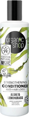 Organic Shop přírodní posilující kondicionér díky vysoké koncentraci přírodních složek obnovuje přirozenou strukturu oslabených vlasů, které tak budou silnější a pevnější. Směs organického výtažku z řas a organického oleje z citronové trávy vaše vlasy vyživuje a hydratuje, posiluje kořínky a snižuje vypadávání.