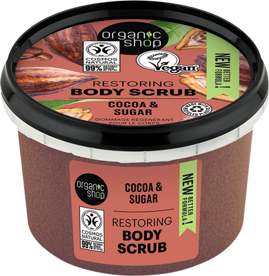 Organic Shop přírodní luxusní tělový peeling s organickým kakaovým máslem a přírodním cukrem okamžitě obnovuje pružnost vaší pokožky, dodá jí úžasnou vláčnost a svůdnou vůni čokolády.