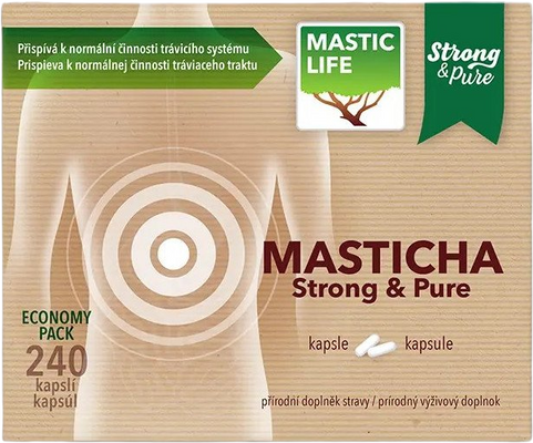 Čistý prášek z chioské mastichy bez přísad pro normální činnost trávicího traktu. Každá kapsle je samostatně balena v blistru a chráněna před kontaminací až do okamžiku užití. Masticlife Strong&Pure kapsle obsahují optimální množství prášku (350 mg) s ohledem na doporučené dávkování a pohodlné užívání. Je použita kapsle dle veganských standardů.