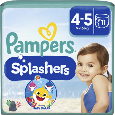 Vaše děťátko může v jednorázových plenkových kalhotkách Pampers Splashers bezstarostně dovádět i ve vodě. Na rozdíl od běžných plenek Pampers Splashers ve vodě nenasáknou: padnou jako plavky a chrání jako Pampers. Díky nádhernému designu se žraločátkem se brzy stanou pro jeho malé fanoušky nezbytností.
