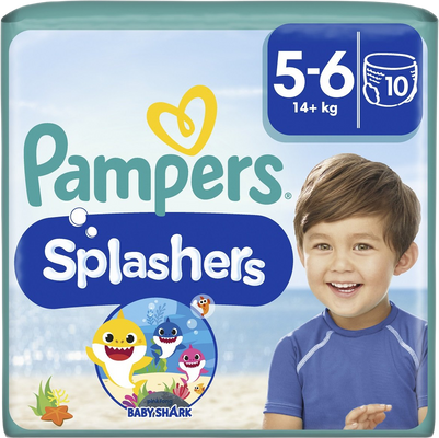 Vaše děťátko může v jednorázových plenkových kalhotkách Pampers Splashers bezstarostně dovádět i ve vodě. Na rozdíl od běžných plenek Pampers Splashers ve vodě nenasáknou: padnou jako plavky a chrání jako Pampers. Díky nádhernému designu se žraločátkem se brzy stanou pro jeho malé fanoušky nezbytností.