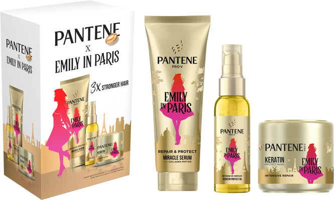 Pantene Sada produktů Pantene x Emily in Paris: sérum 200ml, olej 100ml a maska na vlasy 300mlVše o produktuDoplňující informaceHodnocení produktuLimitovaná edice Pantene x Emily in Paris? Ó la lá! Odhalte tajemství dokonalých vlasů s kolekcí Pantene x Emily in Paris, v níž najdete šampon, kondicionér, vlasovou masku a olej pro až 3x silnější** vlasy, co vypadají nejen zdravě, ale i krásně.