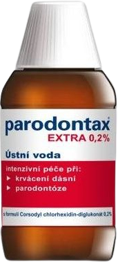 Díky jeho prokázané účinnosti vám zubař pro krátkodobé používání, obvykle na dva až čtyři týdny, může doporučit ústní vodu parodontax Extra 0,2 %.