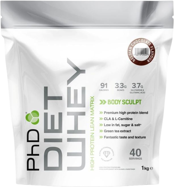 PhD premium bílkovinná směs [syrovátkový bílkovinný koncentrát, mléčný bílkovinný koncentrát (z toho 80% micelární kasein), sójový bílkovinný izolát], nízkotučný kakaový prášek, waxy ječná mouka, moučka z lněného semínka, zahušťovadla (arabská guma, guarová guma, xanthanová guma), aroma, konjugovaná kyselina linolová (CLA) prášek [olej z Světlice barvířské (bohatý na CLA), glukózový sirup, mléčná bílkovina, emulgátor sójovýlecitin, vitamin E], L-karnitin, zelený čaj extrakt, sůl (jen příchuť belgian chocolate), sladidlo sukralóza.