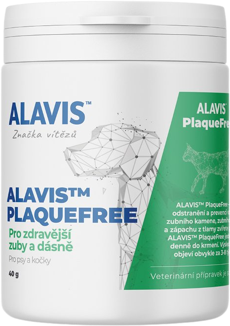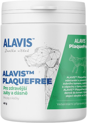 Alavis PlaqueFree je přelomový prostředek v péči o zuby a dásně psů a koček. Významně omezuje zubní plak a zubní kámen a odstraňuje zápach z tlamy. Přípravek je ve formě prášku a proto se lehce přidává do běžné potravy. Jedná se o 100% přírodní produkt.