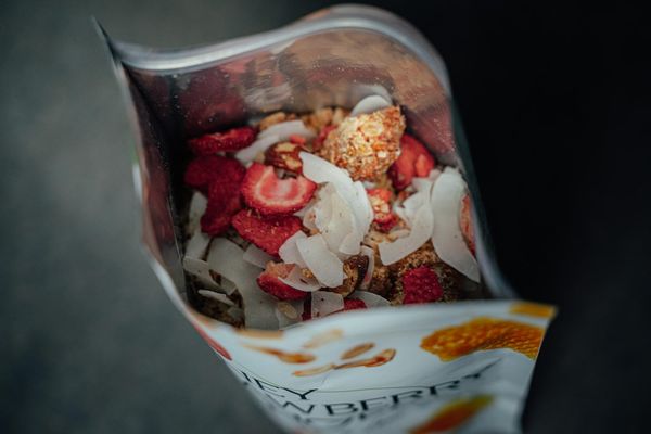 Křupavá směs ořechů, semínek, kokosu a sušených jahod, jemně slazená kvalitním včelím medem. Granola je pečená pomalu, aby si zachovala přirozenou chuť a křupavost, přičemž neobsahuje žádný rafinovaný cukr, lepek ani palmový olej. Díky vyváženému poměru zdravých tuků, vlákniny a přirozeně sladkých surovin poskytuje dlouhodobou energii a podporuje zdravé trávení. Ideální pro snídani, svačinu nebo jako doplněk do jogurtů a smoothie.