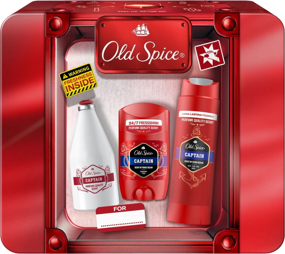 Old Spice Captain Xmas dárková sada je dokonalým dárkem pro muže, kteří chtějí vypadat a vonět skvěle každý den. Tato sada obsahuje sprchový gel, tuhý deodorant a vodu po holení, vše s ikonickou vůní Captain. Elegantní a znovupoužitelná plechová krabička dodává sadě styl a praktičnost. Ideální pro ty, kteří hledají svěžest, sebevědomí a legendární vůni v jednom balení.