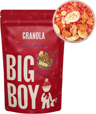 Big Boy Proteinová granola s bílou čokoládou a ovocem 360 gVše o produktuDoplňující informaceHodnocení produktuBig Boy se spojili s influencerkou Kamilou Šikl a namíchali křupavé a voňavé granoly plné čokolády, ořechů a lyo ovoce. Vyber si granolu podle své chuti a krásné ráno může začít. Okamžitá závislost zaručena!