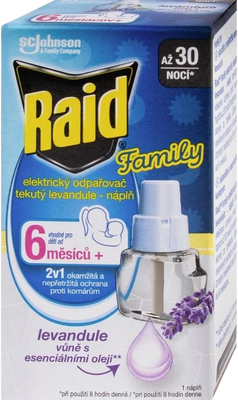 Raid Family tekutá náplň do el. odpařovače s vůní levandule - 30 nocíVše o produktuDoplňující informaceHodnocení produktuÚčinně zabíjí a odpuzuje komáry i při mírně otevřených oknech.
