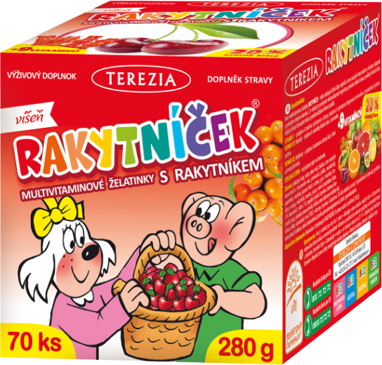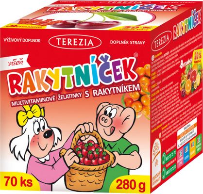 Želatinky RAKYTNÍČEK jsou unikátní nejen svou výbornou ovocnou chutí, obsahují totiž až 20 % ovocné šťávy, ale i obsahem 9 vitaminů. Obsahují celou řadu zdraví prospěšných látek v přirozené a lehce stravitelné formě. RAKYTNÍČEK želatinky jsou vyráběny bez konzervačních látek, bez přidaného barviva a bez sladidel. Více informací