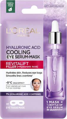 L'Oréal Paris Revitalift Filler Textilní oční maska s chladivým efektem 13 gVše o produktuDoplňující informaceHodnocení produktuPředstavujeme chladivé oční sérum s kyselinou hyaluronovou L'Oréal Paris s obsahem 1% kyseliny hyaluronové + kofeinu. Každá tkáňová maska, která poskytuje plné pokrytí očí, obsahuje ½ lahvičky očního séra v množství* a má chladivý kryo efekt, který pomáhá odhalit oživené oči.