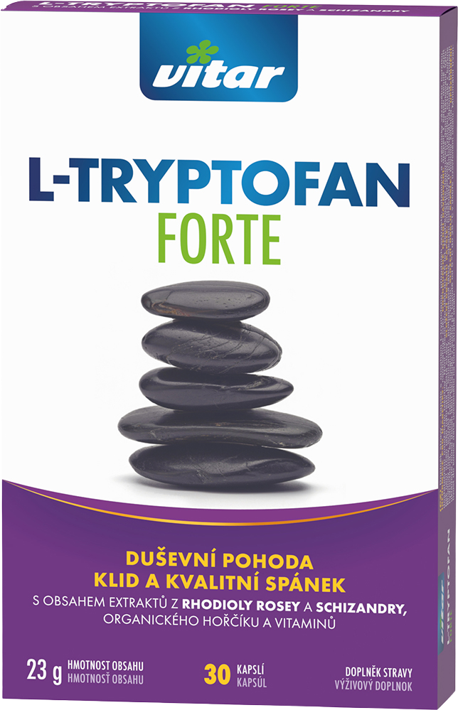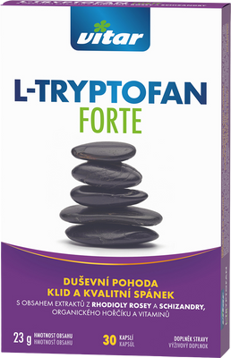 Vitar L-Tryptofan Forte obsahuje účinné látky. Aminokyselina L-tryptofan je vhodně doplněna přírodními extrakty z Rhodiola rosa a Schizandry. Ty obsahují adaptogeny, látky. Složení je vhodně doplněno o hořčík, vitamin B6 a další účinné látky. Více informací