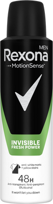 Rexona Men Invisible Fresh & Power Antiperspirant sprej 150 mlVše o produktuDoplňující informaceHodnocení produktuDeodorant Rexona MEN Invisible Fresh Power chrání před potem a zápachem díky technologii Motionsense™ – čím více se budete hýbat, tím účinnější bude vaše ochrana. Nabízí vám 7násobnou ochranu: pomáhá chránit před pocením, nepříjemnými pachy, bílými a žlutými skvrnami na oblečení, podrážděním pokožky, eliminuje lepkavý pocit na pokožce a aktivuje se při pohybu. Rexona. Nezradí tě!