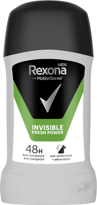 Rexona Men Fresh & Power Tuhý antiperspirant 50 mlVše o produktuDoplňující informaceHodnocení produktuRexona MEN tuhý antiperspirant Fresh & Power je účinný pomocník, který spolehlivě bojuje proti žlutým skvrnám na bílém oblečení a bílým stopám na černém oblečení. Poskytuje ochranu proti pocení a zápachu po dobu 48 hodin. Obsahuje také inovativní patentovanou technologii Motionsense™ založenou na přítomnosti mikrokapslí, jež obsahují vůni a díky tření při pohybu postupně praskají. Dochází tak k pozvolnému uvolňování parfemace podle fyzické aktivity. Platí zde úměra, že čím více se člověk pohybuje, tím intenzivněji antiperspirant voní. Pro váš svěží pocit po dlouhou dobu!. Rexona. Nezradí tě!