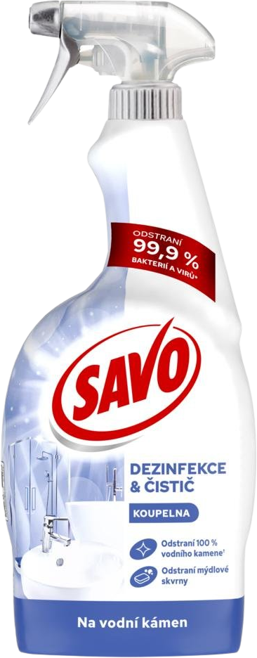 Savo dezinfekční sprej do koupelny efektivně odstraní vodní kámen a mýdlové skvrny ze všech omyvatelných povrchů v koupelně. Snadno se oplachuje a důkladně odstraní až 99,9 % bakterií a virů. Dlouhotrvající svěží vůně provoní celou vaši koupelnu. Více informací