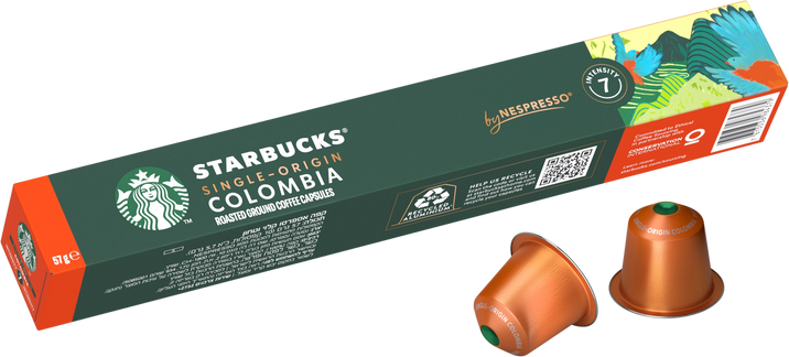 Kávové kapsle kompatibilní s kávovary NESPRESSO®. Užijte si STARBUCKS® kávu, kterou milujete, aniž byste museli opustit dům. Tato 100% kolumbijská káva má zaoblené tělo, šťavnatou chuť s výraznou oříškovou tečkou. Závazek 100% etického původu kávy ve spolupráci s Conservation International