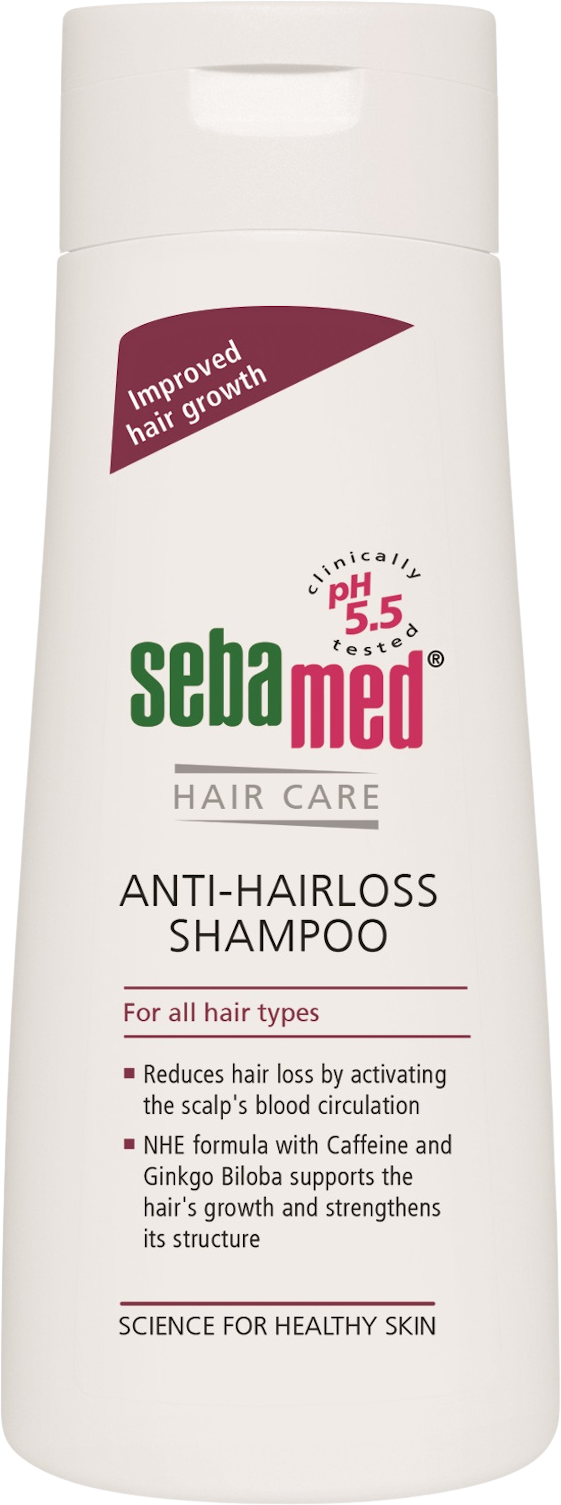 - Účinnost šampónu SEBAMED proti vypadávání vlasů je založena na NHE formuli s kofeinem a gingko bilobou.