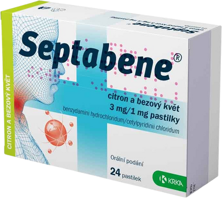 Septabene® 3 mg/1 mg citron a bezový květ 24 pastilekVše o produktuDoplňující informaceHodnocení produktuObsahuje léčivé látky benzydamin-hydrochlorid a cetylpyridinium-chlorid. Používá se k léčbě příznaků bolesti v krku spojených s mírnými infekcemi v ústech a krku (včetně zánětu dásní a zánětu hltanu).