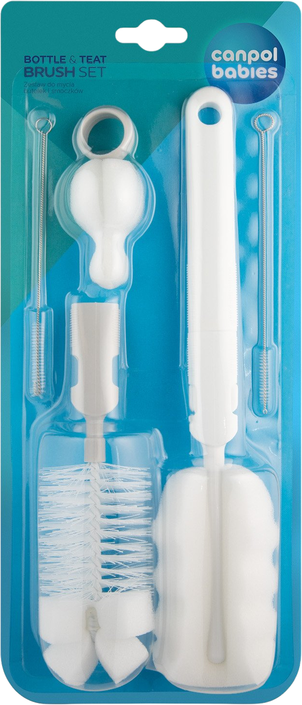 Sada kartáčů k bezpečnému čištění láhví a saviček před jejich sterilizací. Sada obsahuje kartáč s hubkou, pěnový kartáč, pěnový kartáček na savičky a dva malé kartáčky. Více informací