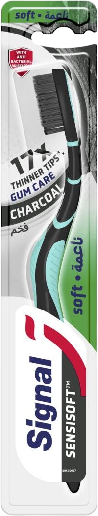 - Jemný zubní kartáček Signal Sensisoft Charcoal má štětinky nasáklé přírodním aktivním uhlíkem a ionty stříbra, díky čemuž se na štětinkách nedrží bakterie až po dobu 3 měsíců
