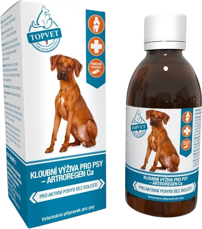 Artroregen Ca - originální receptura spojuje chondroprotektivní stavební látky (glukosamin sulfát, chondroitin sulfát) a unikátní bylinný komplex (šišák bajkalský, bršlice kozí noha, přeslička rolní nať, rdesno nať). O výše uvedených surovinách je historicky známo a je dohledatelné v literatuře, že jsou vhodné k preventivnímu a regeneračnímu použití u psů všech věkových kategorií. Zmírňuje bolest poškozených kloubů a zlepšuje hybnost a výkonnost. Doporučujeme užívat preventivně od 3 měsíců věku a jako podporu terapie psů s poškozenými klouby.