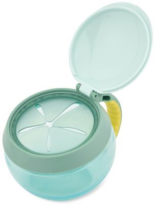 Šikovný nápad na cesty. Nádoba má víčko, které po otevření drží, před vysypáním obsahu jej chrání pružné lamely, které pustí dětskou ručičku dovnitř, ale nepustí svačinu ven. Více informací