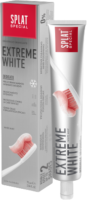 Zubní pasta SPLAT Special EXTREME WHITE s fluoridem poskytuje bělicí účinek viditelný pouhým okem díky inovativním mikrogranulím s karbamid peroxidem, kulatým lešticím částicím a přírodním enzymům. Fluoridové ionty vytvářejí efektivní ochrannou vrstvu proti zubnímu kazu na povrchu skloviny.