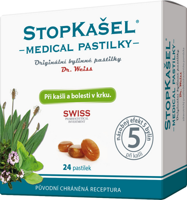 Zdravotnický prostředek. STOPKAŠEL Medical pastilky Dr. Weiss® obsahují unikátní směs 5 bylin, které pomáhají při projevech suchého a vlhkého kašle. Více informací