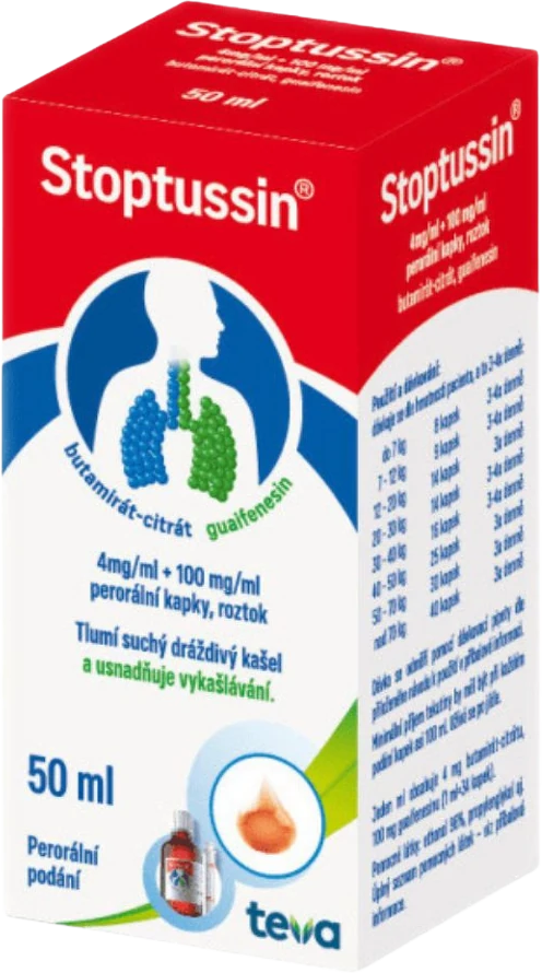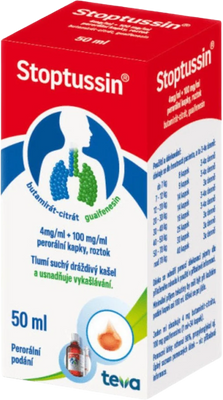 Stoptussin perorální kapky 4mg/ml+100mg/ml 50 mlVše o produktuDoplňující informaceHodnocení produktuPřípravek se používá k léčbě suchého, dráždivého a obtížně ztišitelného kašle při virových infekcích horních a dolních dýchacích cest, při zánětu hrtanu, průdušek a plic. Na doporučení lékaře lze přípravek Stoptussin podat i k utišení kašle před a po operaci, u astmatu, tuberkulózy a zaprášení plic.