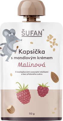 Šufan Kapsička s mandlovým krémem malinová 110 gVše o produktuDoplňující informaceHodnocení produktuOvocné kapsičky bývají fajn, ale často dětem nabídnou jen rychlou dávku cukru. Šufan proto vytvořil kapsičku s mandlovým krémem a malinami, která je chutná, výživná a poctivě zasytí. Šťavnaté, přirozeně sladké maliny se v ní spojují s bezlepkovými ovesnými vločkami a poctivým mandlovým máslem, aby děti měly energii na dopolední školní aktivity, výlety nebo hravé chvíle na hřišti.