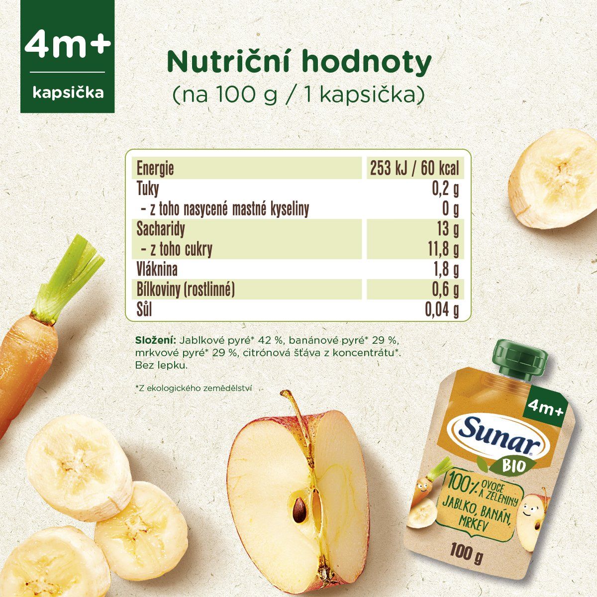 Jablkové pyré1 42 %, banánové pyré¹ 29 %, mrkvové pyré¹ 29 %, citrónová šťáva z koncentrátu¹.