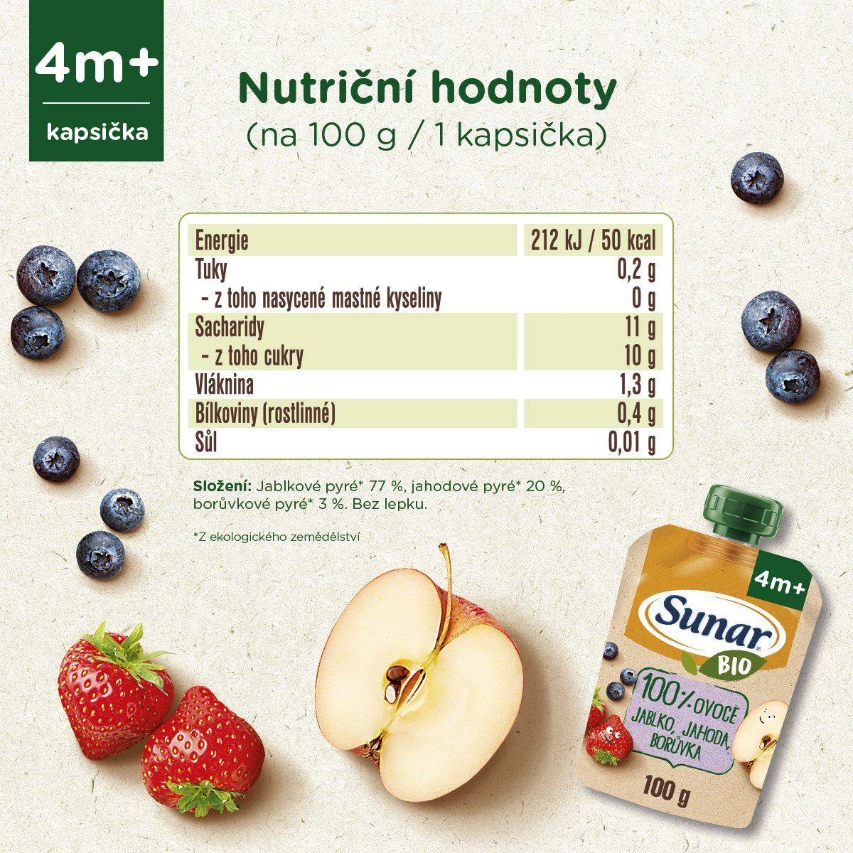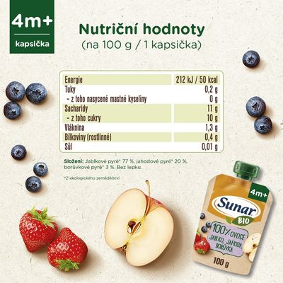 Jablkové pyré¹ 77 %, jahodové pyré¹ 20 %, borůvkové pyré¹ 3 %. Bez lepku. ¹ z ekologického zemědělství.