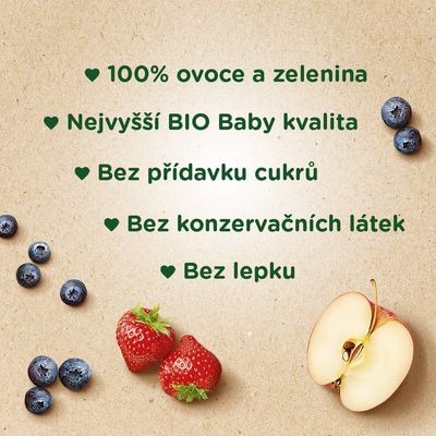 BIO kapsičky obsahují 100% ovocné pyré z vyzrálého šťavnatého ovoce a zeleniny v nejvyšší BIO Baby kvalitě. Dětem je můžete dávat již od ukončeného 4. měsíce věku.