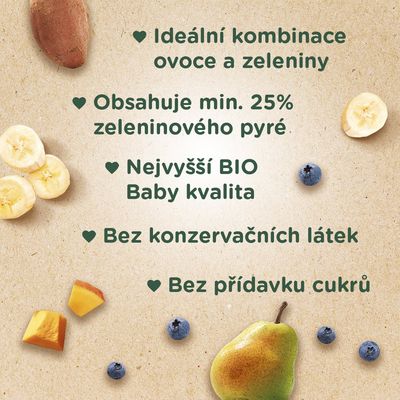Směs ovoce* 70% (banánové pyré* 30%, hruškové pyré* 30%, borůvkové pyré* 10%), směs zeleniny* 29,5% (dýňové pyré* 15%, batátové pyré* 14,5%), citrónová šťáva z koncentrátu* 0,5%.