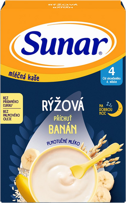 Sunar mléčná rýžová kaše na dobrou noc banánová 210 gVše o produktuDoplňující informaceHodnocení produktuSunar mléčná kaše rýžová s příchutí banánu je příkrm vhodný pro děti od ukončeného 4. měsíce. Kaše neobsahuje žádný přidaný cukr, svou skvělou chuť si získává díky obsahu plnotučného mléka. Rýžová kaše je přirozeně bezlepková, hodí se tedy jako první příkrm při zavádění pevné stravy do jídelníčku. Kaše je navíc obohacena o vitaminy a minerální látky, které jsou důležité pro správný růst a vývoj kojenců a malých dětí např. železo přispívá ke správné funkci imunitního systému.
