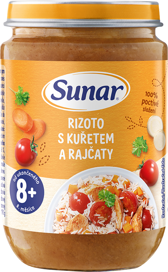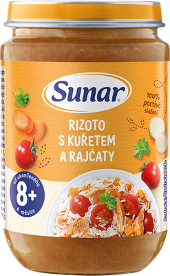 Sunar Příkrm rizoto s kuřetem a rajčaty 8m+, 190 gVše o produktuDoplňující informaceHodnocení produktuSunar příkrm Rizoto s kuřetem a rajčaty je vhodný pro děti od ukončeného 8. měsíce. Během chvilky máte navařeno hravě a s chutí. Bez přidané soli, ze 100 % poctivých surovin v té nejvyšší baby kvalitě.