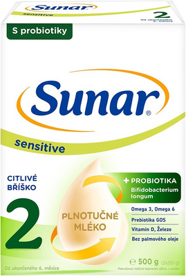 Sunar Sensitive 2 je pokračovací mléčná kojenecká výživa, v prášku. Je určen pouze pro výživu kojenců od ukončeného 6. měsíce věku dítěte v období odstavování nebo pokud nemohou být kojeni. Má být pouze součástí smíšené a vyvážené stravy. Potravina pro zvláštní výživu. Kojení je pro novorozence a kojence nejlepší způsob výživy. Sunar Sensitive 2 není určen jako náhrada mateřského mléka během prvních šesti měsíců života dítěte. Rozhodnutí o zahájení podávání příkrmů, včetně jakékoliv výjimky z pravidla věku šesti měsíců, by mělo být přijímáno pouze na radu nezávislých osob kvalifikovaných v lékařství, výživě nebo farmacii, nebo jiných odborníků odpovědných za péči o matku a dítě, v závislosti na individuálním růstu a rozvojových potřebách konkrétního kojence. Pro zdraví kojenců je důležité správné dodržování návodu k přípravě. Při přípravě používejte pouze přiloženou odměrku. Neměňte poměr prášku a vody.