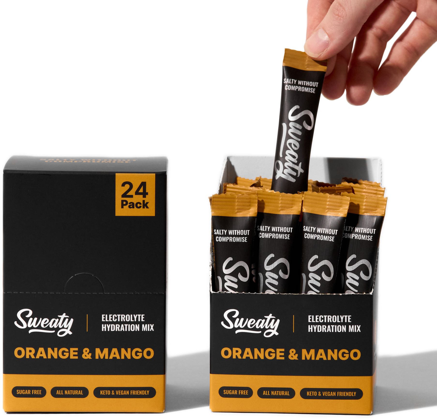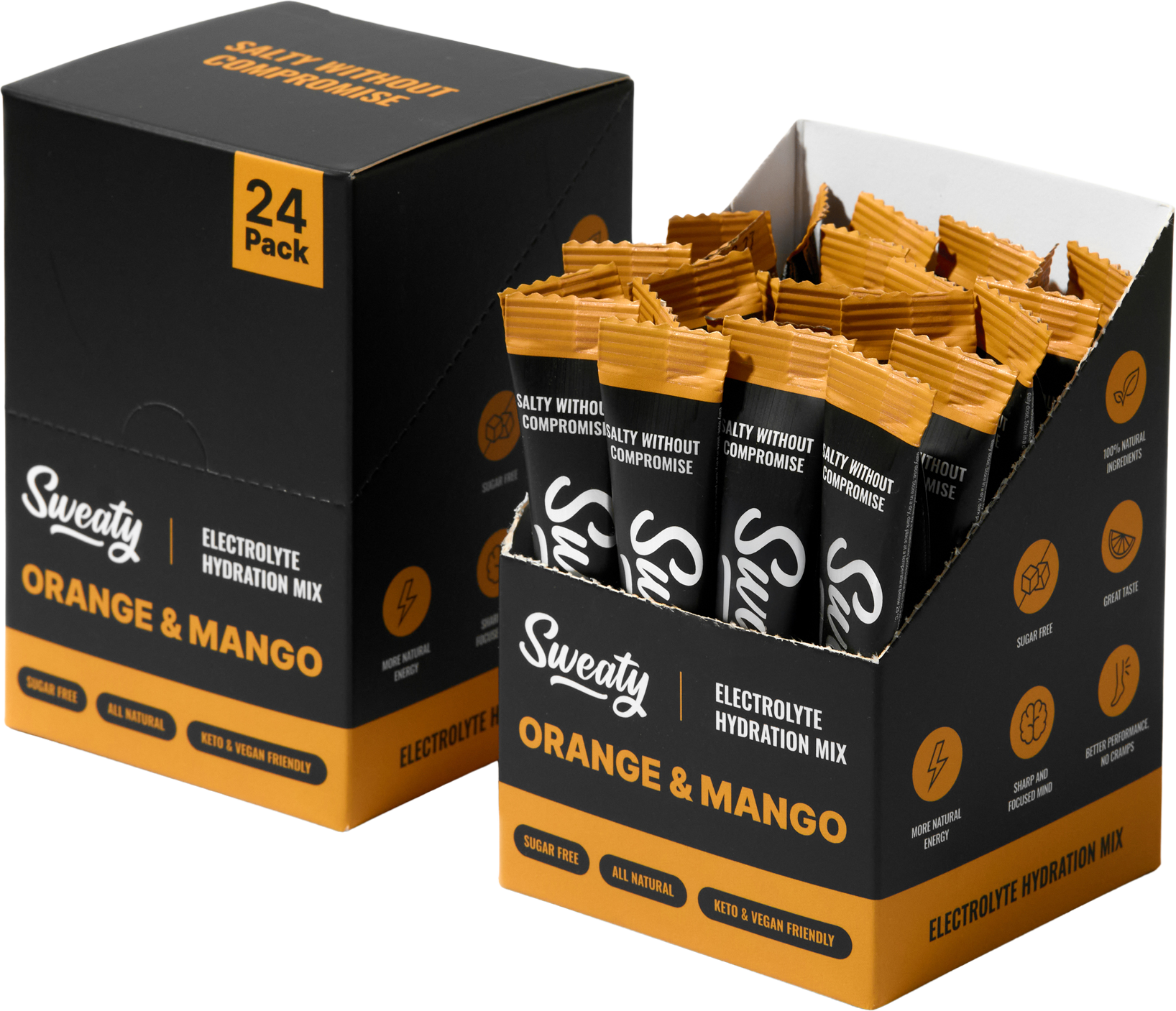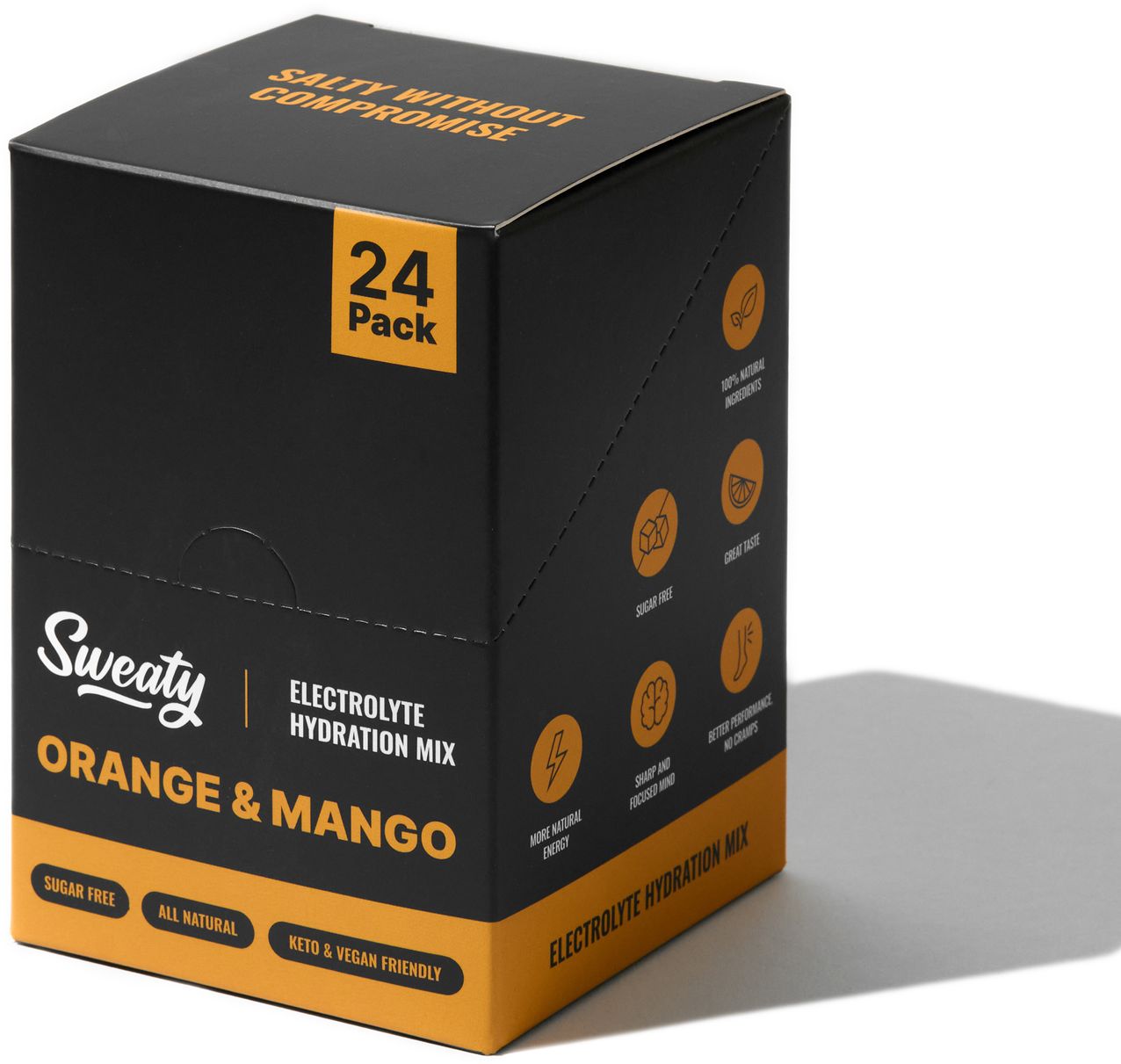 Sweaty Electrolyte Hydration Mix Mango & Orange 24 x 6 gVše o produktuDoplňující informaceHodnocení produktuSweaty Electrolyte Hydration Mix Mango & Orange je moderní elektrolytový nápoj vytvořený pro efektivní hydrataci, prevenci křečí a udržení výkonu při tréninku i v horku. Obsahuje čtyři klíčové minerály – sodík, draslík, hořčík a vápník – ve vyváženém poměru pro optimální vstřebávání.