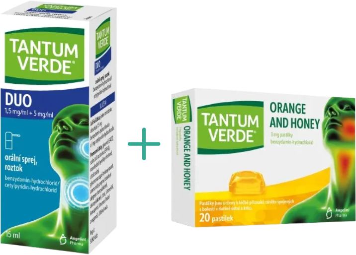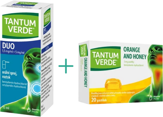 Tantum Verde DUO 1,5 mg/ml + 5 mg/ml orální sprej, roztok 15 ml a Tantum Verde Orange and Honey 3 mg 20 pastilekVše o produktuDoplňující informaceHodnocení produktuTantum Verde DUO 1,5 mg/ml + 5 mg/ml orální sprej, roztok 15 ml